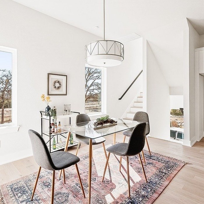 The rug is the hero here. Glass tables can disappear visually, so the rug gives the dining area a “zone” and makes it feel grounded. For glass dining room table decor ideas, I like using one long centerpiece that matches the table shape, like a low greenery runner or a line of small vases. Another hack is to keep your table accessories in a similar tone as the chairs, so the whole thing feels tied together. When everything matches just a little, it looks expensive, even if it wasn’t.