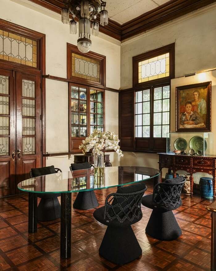 Historic room vibes with sculptural black chairs and minimal glass styling