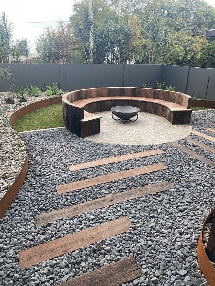 What I love most about this design is how the gravel and pavers work together. The gravel is laid down to create a walkway and the pavers form a circular pattern to define the seating area. The benches themselves are curved, not just for aesthetic appeal, but to keep the fire pit in focus, making this the perfect setup for evening hangouts.