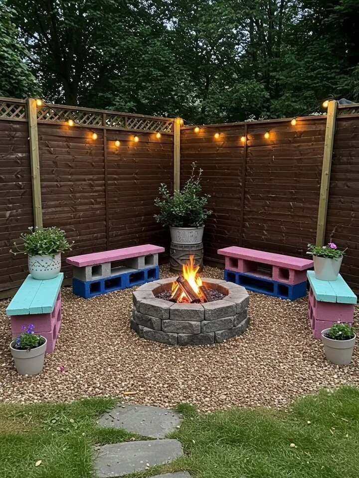 The clever use of pallet benches adds a casual, DIY flair that contrasts beautifully with the fire pit's structured stonework. The colorful pallets add personality and warmth, making this space feel like a lively hangout spot. The lighting strung along the fence enhances the ambiance, making it an ideal gathering place in the evening.