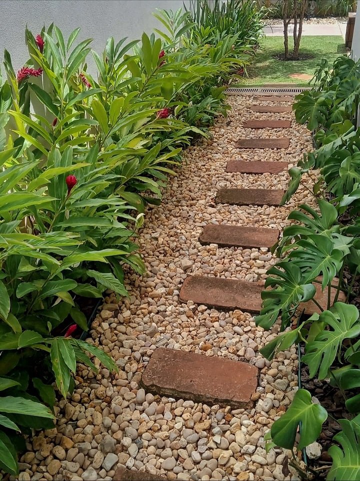 What I really enjoy about this design is how the natural, earthy colors of the gravel and pavers are complemented by the vibrant plants along the sides. The pavers serve as functional steps, while the gravel keeps the look relaxed and natural. This setup works wonderfully for garden paths, offering both a decorative and practical solution for navigating through your backyard.