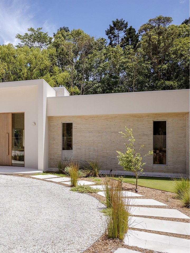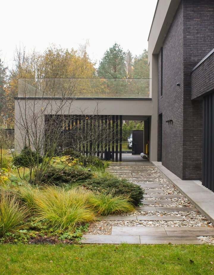 There’s something so welcoming about a gravel patio with pavers leading to the front door. This design has large rectangular pavers spaced out with gravel filling the gaps, guiding you to the entrance. The entire path is flanked by simple, elegant plants, giving the space a tidy but natural feel.