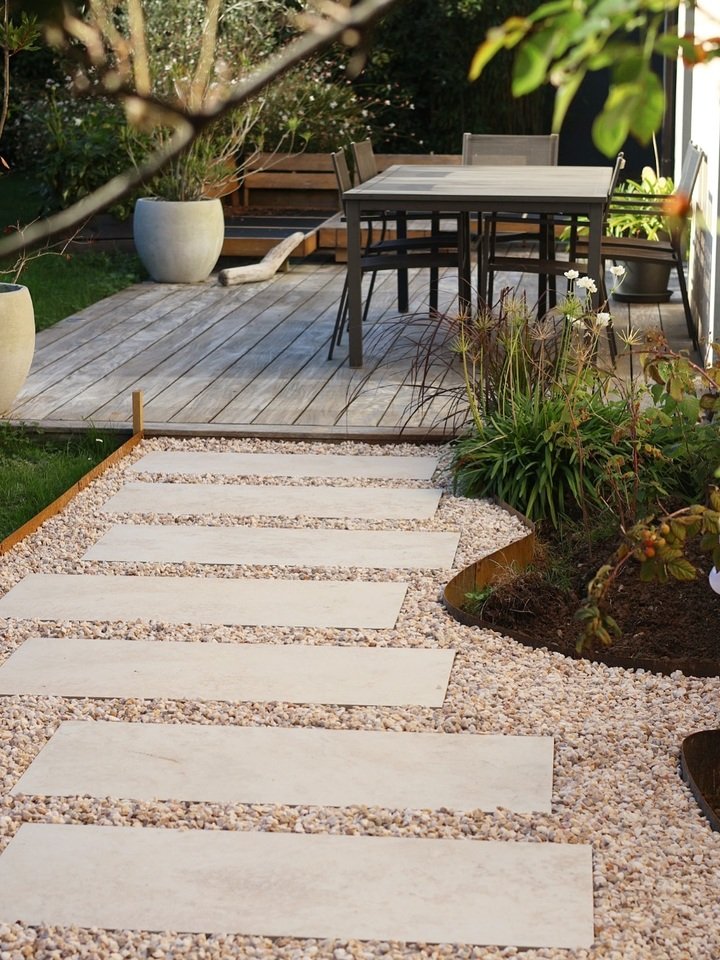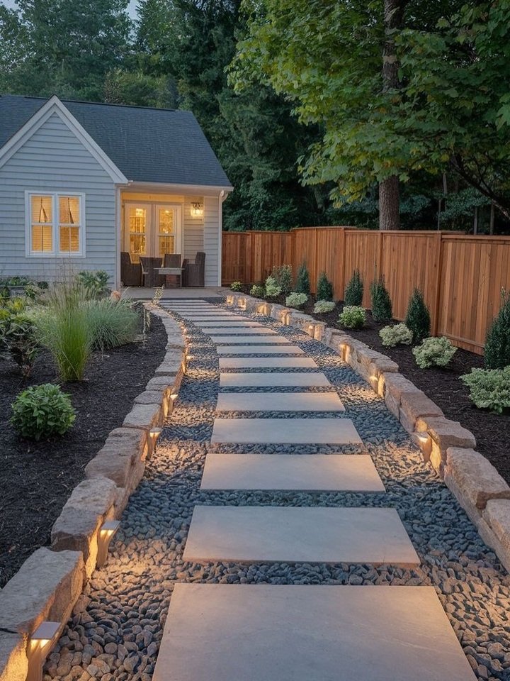 This design feels super clean, especially for a modern or contemporary home. The pavers create a clear path, while the gravel serves more as a textural background, not trying to steal the show. I can totally see this working in a backyard that’s not too huge but still needs a little something extra to make it feel polished.