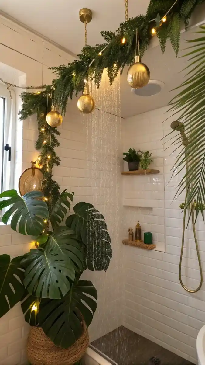 Yes. Monstera, ferns, and pothos love humidity and look great with garland and ornaments in a green Christmas bathroom decorations setup.
