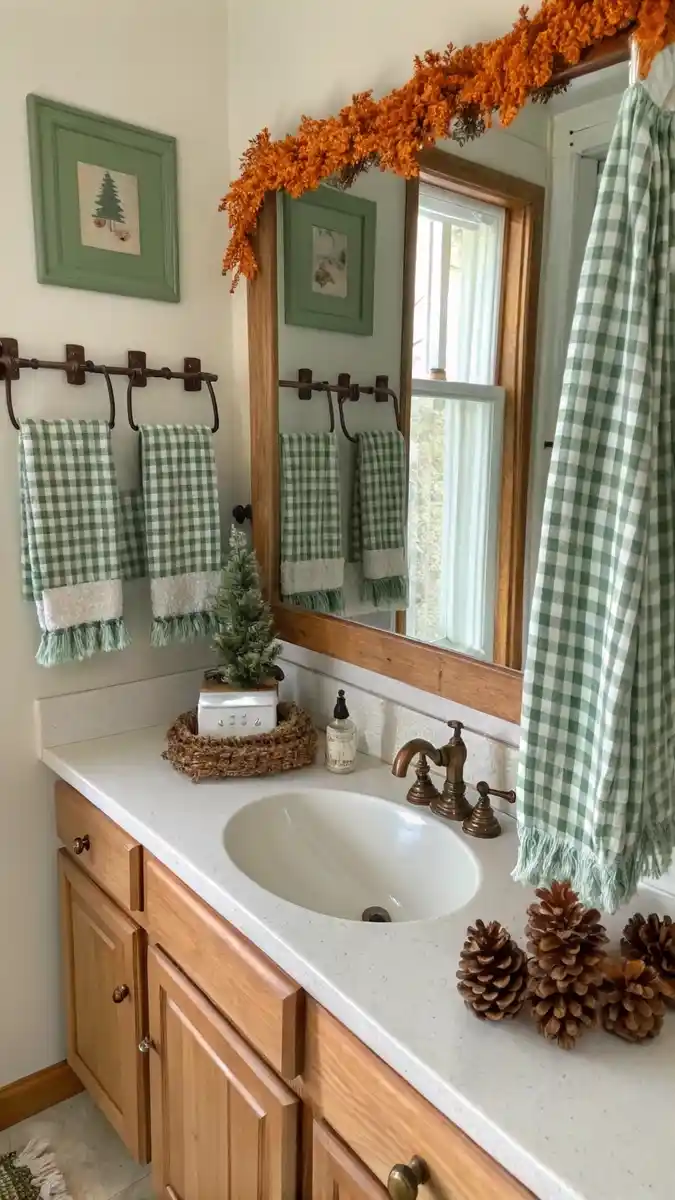 This look is simple comfort. Mint check towels hang in a neat row, a tiny tree sits on a woven tray, and pinecones scatter by the sink. The wood frame mirror and natural vanity make the green feel friendly. I like this one for older homes or rentals because it reads cozy without changing a thing.