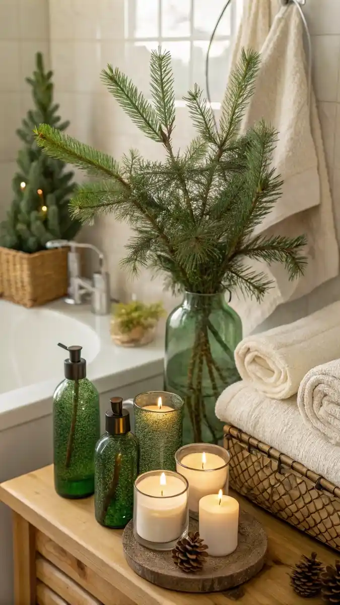 This photo sold me on winter spa energy. Green glass bottles line up next to white candles, rolled towels, and a big vase of cedar stems. In the back, a basket holds another tiny tree. It is all texture and scent. When I lit the candles my whole room felt like a calm cabin.