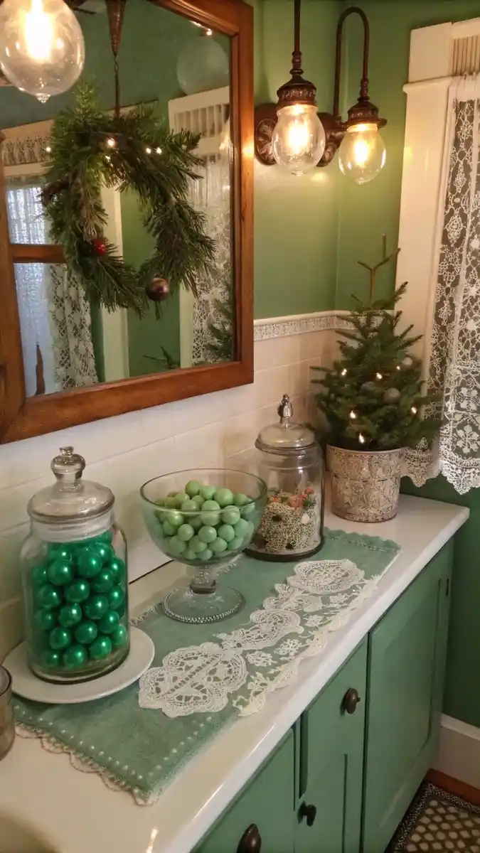For mint green holiday bathroom accents, mix shiny and matte ornaments so the jars don’t read flat. Raise one jar on a plate for height. If you’re worried about kids, use shatterproof balls. I keep the rest of the counter clear and let the lace do the talking. One warm bulb in the sconce makes the glass sparkle. This counts as green festive bathroom decor that is playful yet tidy.
