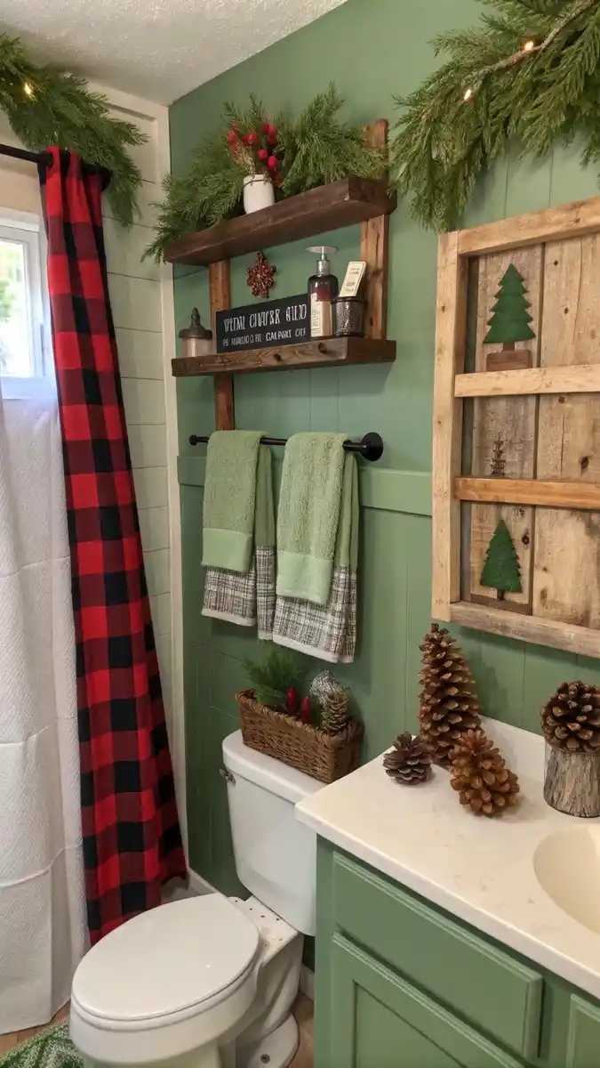 For forest green Christmas bath decor, watch your patterns. If you use buffalo check, keep the towels mostly solid with only a small plaid band. Place the shelf just high enough that you can still reach the jars. I use a timer string so the lights pop on at five every evening. This kind of green Christmas powder room decor makes the whole room feel welcoming to guests carrying winter coats.