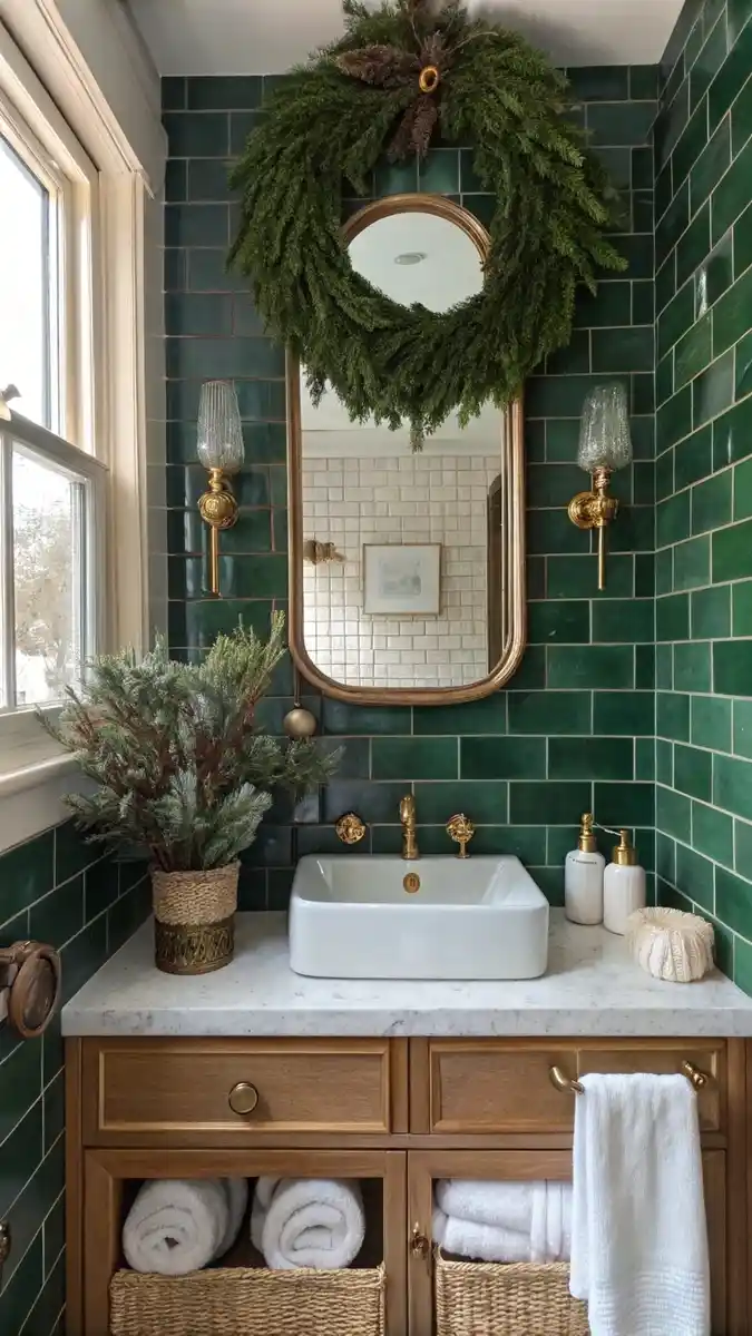 To copy this luxe green Christmas bathroom decorations moment, mind scale. The wreath should be larger than the mirror by a third so it frames, not fights it. Keep your bottles simple white so the eye rests. If your tiles are not green, a temporary peel-and-stick panel behind the mirror can give the effect. Use warm LED bulbs to keep the brass honey toned. It is a high-impact version of emerald green bathroom holiday decor that still feels serene.