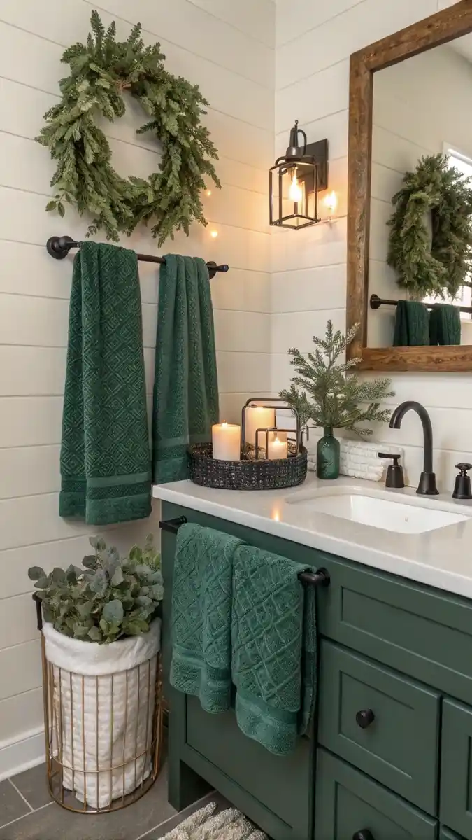 Last idea, and it’s super usable. Shiplap walls, a wreath above the towel bar, deep hunter towels with a pretty pattern, and a black lantern sconce. The vanity is dark green so the towels look layered and rich. It is the kind of green christmas bathroom decor that works every single day of December.