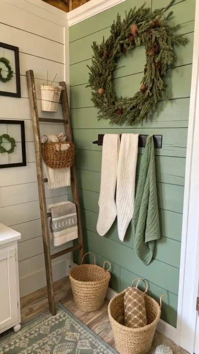 The farmhouse crowd will love this one. Soft green shiplap gets a big evergreen wreath with pinecones. A rustic ladder holds folded towels and knitted washcloths, and chunky baskets warm up the floor. It feels like a cozy cabin bath where someone left hot cocoa outside the door. In real life, it’s super practical.