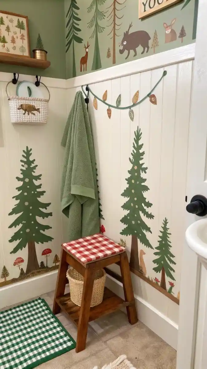 This photo screams storybook. Forest animal decals, pine trees, and gingham stools make a tiny bath feel like a winter trail. The palette stays in soft green, cream, and warm wood, which calms all the cute details. For families, this is such a fun version of green Christmas powder room decor.