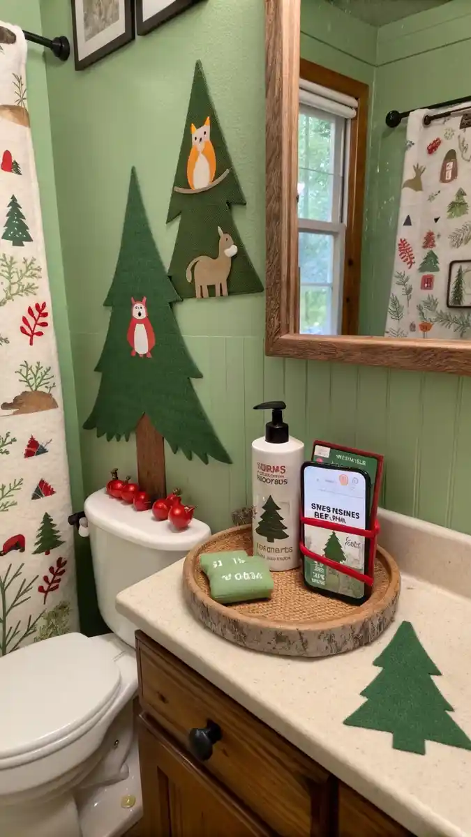 To copy, keep shapes big and friendly. Three tree decals at different heights, two animals, and a small garland of felt leaves. Add an easy-clean rug and a low hook for kids’ towels. For green holiday bath decorations without damage, use removable wall decals and command hooks. I tucked a small basket of bath crayons on the shelf so the theme even shows up at tub time. It’s playful but not wild, which is exactly what I want before bedtime.