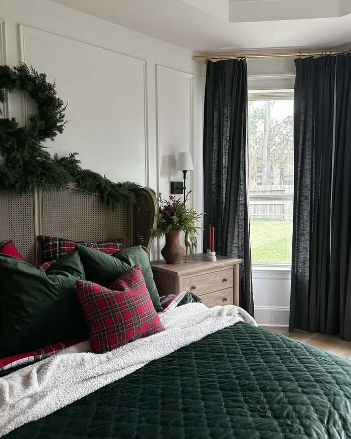 This room hits that cozy lodge vibe without getting heavy. The cane headboard warms the wall molding, and the chunky evergreen quilt has that satisfying weight that makes you nap by accident. Plaid pillows pop bright red against velvet green shams, so your eye gets pattern and then rests again. The wreath and low garland frame the headboard like a crown. My confession, I used to be scared of dark curtains, but those charcoal drapes make the whole space feel finished and a little cinematic.