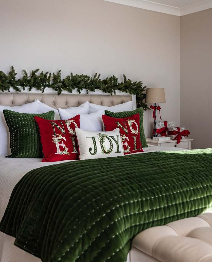You want tradition that still looks fresh? This one hits the sweet spot. The forest velvet quilt drapes like a theater curtain and the stitched lines give it quiet movement. White sheets, puffed shams, and a tidy garland tucked behind the headboard finish the base. Then the red “NOEL” pillows and the neutral JOY lumbar bring that jolly energy. I love how the garland is low, almost like a leafy headboard extension.