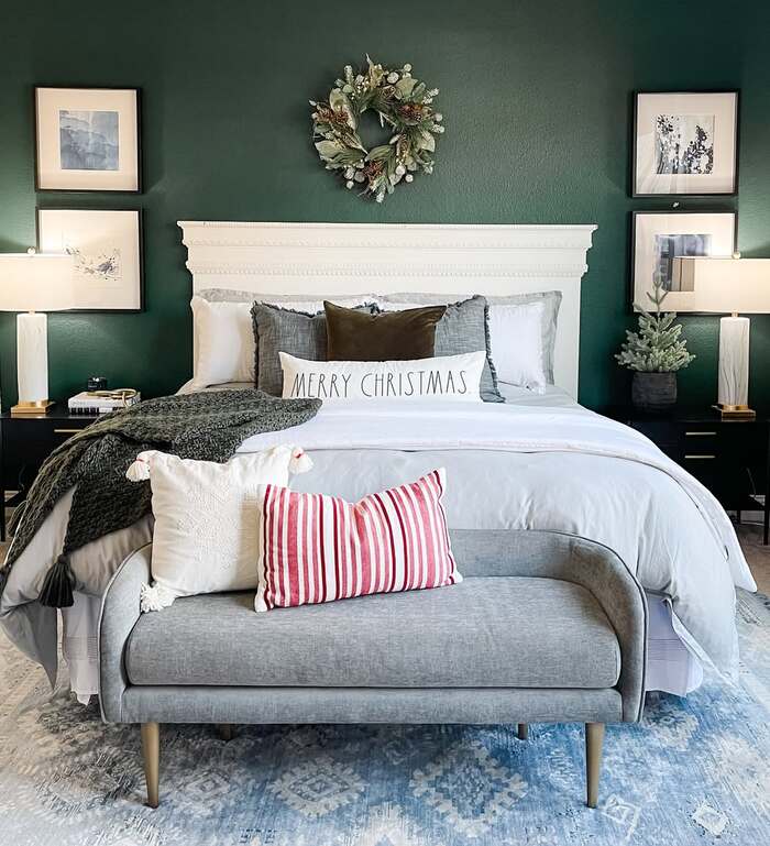 This room is mood central in the best way. The wall is a saturated evergreen, and the crisp white mantle-style headboard pops forward like frosting. A eucalyptus wreath sits perfectly in the middle, not too big, not too tiny. The bench at the foot, gray and tailored, keeps things grown up. Toss in a striped red pillow for just one hint of candy cane and you’re done. If your heart wants a moody green Christmas bedroom, this is your blueprint.