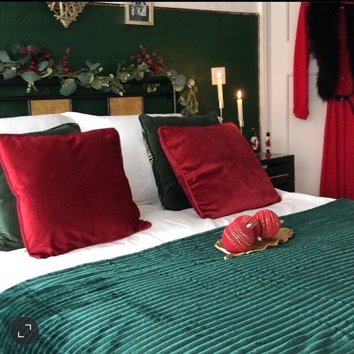 Velvet on velvet with candlelight is my weakness, and this room understood the assignment. The quilt is ribbed emerald and the pillows are a mix of red and green, all plush. A garland with berries sits low on the headboard and a slim candle sconce glows like it’s telling you a secret. It reads glamorous but still cozy. If you’re craving an emerald green Christmas bedroom, this is your moment.