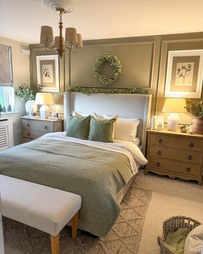 I didn’t expect to love olive walls for December, but wow. The paneled wall adds structure and the leaf wreath reads natural, not staged. Bedding is soft white layered with an olive throw and matching pillows. Wood dressers bring in earth, which makes the palette feel grounded and British-cottage in the best way. This is peak olive green Christmas bedroom and honestly I could nap here forever.