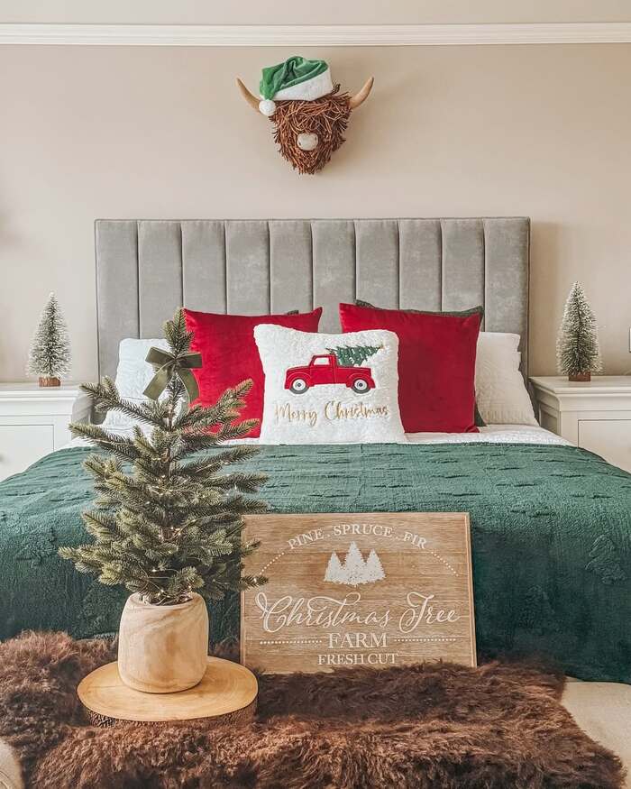 To copy, pick one novelty item and stop. If the pillow is your novelty, keep art simple. Add a small tree in a rustic pot at the foot of the bed and lean a wooden sign near it so you get height. Texture matters here. A sheepskin or faux hide at the foot gives cabin vibes. This is an easy green farmhouse Christmas bedroom for guest rooms because it’s friendly and not too serious. Swap the truck pillow for a tree pillow after December and it still works.