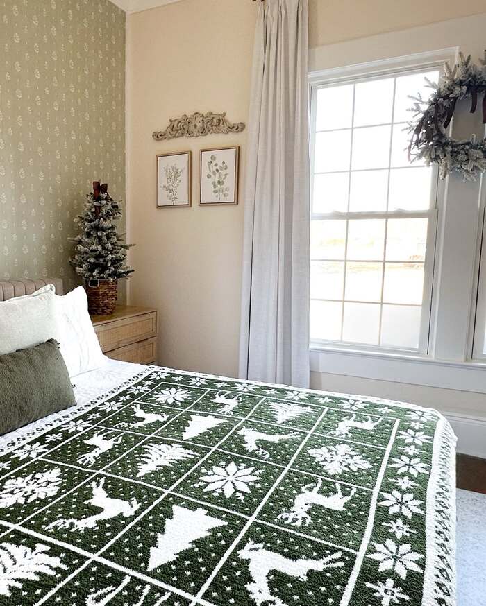 The hero here is that reversible Nordic blanket. Hunter green squares with reindeer and snowflakes in cream. It instantly says winter without glitter or fuss. The accent wall uses a soft green print wallpaper which whispers pattern, not shouts it. A small tree in a wicker basket and two botanical frames finish the corner. If you like quiet but festive, this green and white Christmas bedroom is gold.