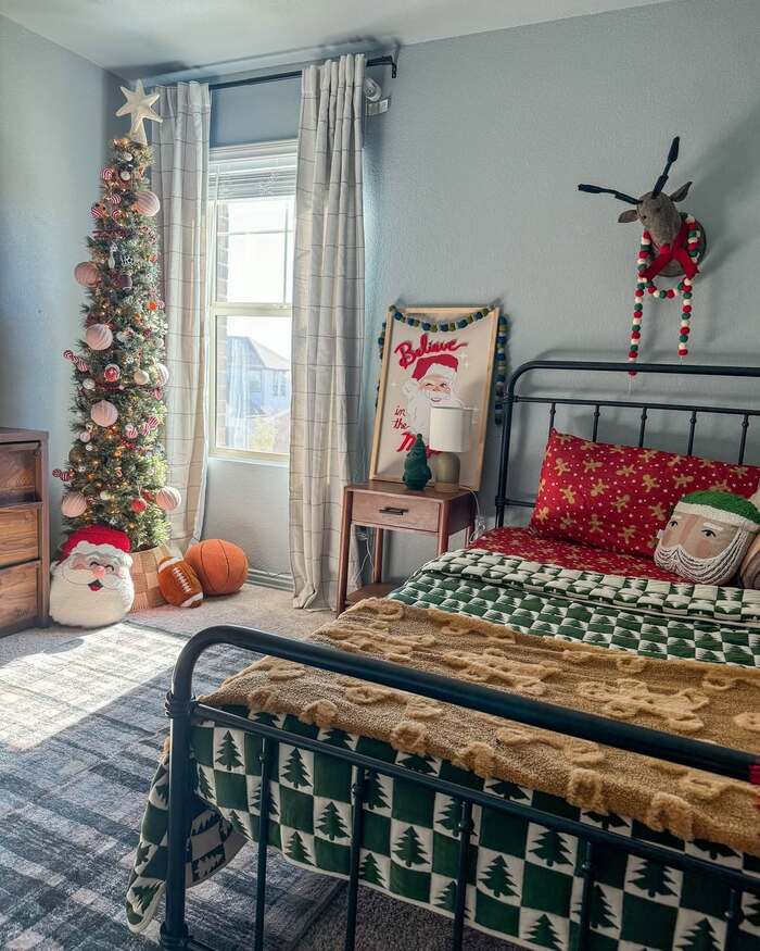 I love this little space because it proves fun can still be cute. There’s a black metal bed, a green check blanket, and a golden knit throw that looks like sugar cookies. The tree is skinny and dressed with blush ornaments that feel playful. Santa art leans on the nightstand and a silly reindeer hangs from the wall. This is the definition of a kids green Christmas bedroom, packed with cheer but still organized.