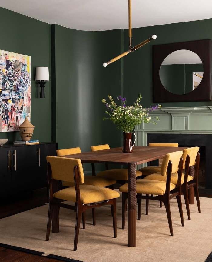 Green dining room decor : Deep forest walls + mustard chairs that feel warm
