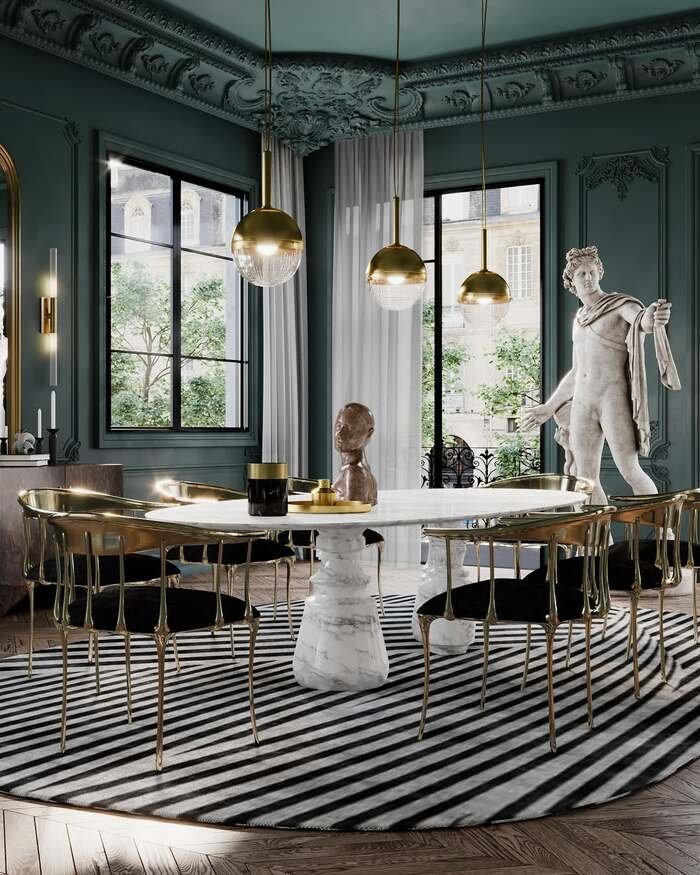 This green dining room decor look is the kind that makes you stand in the doorway for a second like, wait… am I fancy now? The deep teal-green walls feel calm but also kinda bossy, in a good way. Then the gold chairs and gold pendant lights show up like jewelry. I love how the marble table is bright and smooth, so the room doesn’t get too heavy or cave-like.
