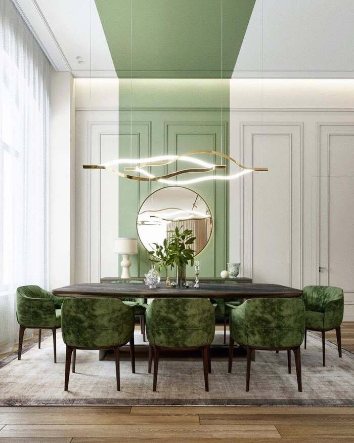 This one is a softer green dining room design, and honestly it feels like a clean inhale. That sage-green block behind the table is like a “quiet accent wall” that still feels special. The green velvet chairs are the star though. Velvet in a dining room sounds scary (spills!), but it looks so rich and cozy that I forgive it.