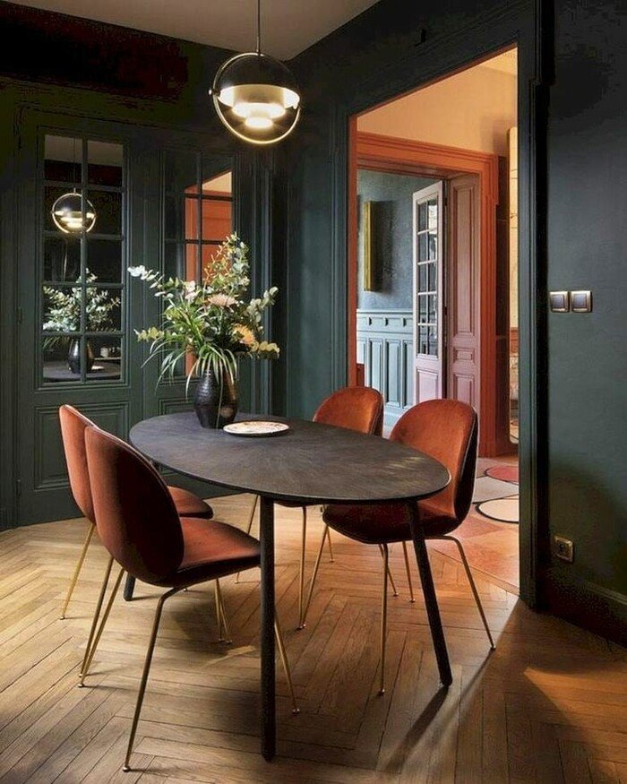 This one feels like a movie scene. The walls are a deep green, and the oval table is dark and smooth, almost like stone. Then the chairs are this rust color, which sounds scary, but it looks amazing. Rust and green together feels earthy and grown-up, like autumn but cooler.