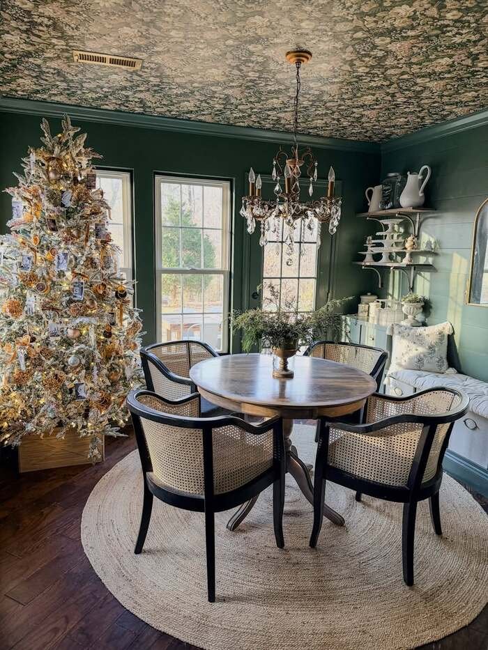 Okay this one is special. The walls are green, the ceiling has a floral pattern, and there’s a whole Christmas tree glowing in the corner. It sounds like chaos, but it’s actually cozy and pretty. The cane chairs feel airy, and the round table keeps the room friendly. It’s like a holiday card, but real.