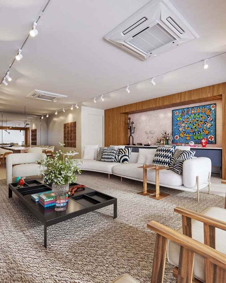 This first living room is probably the coolest one of the bunch. It's set in an industrial-style loft with raw concrete floors that give off that “under-construction” vibe. And honestly, I’m totally into it. The walls are minimal, the lighting is sleek with big industrial pendant lights hanging down, and the grey flooring just ties it all together in a laid-back, but oh-so-cool way. There’s something about how the concrete feels like the perfect base to the modern furniture, giving the space room to breathe.
