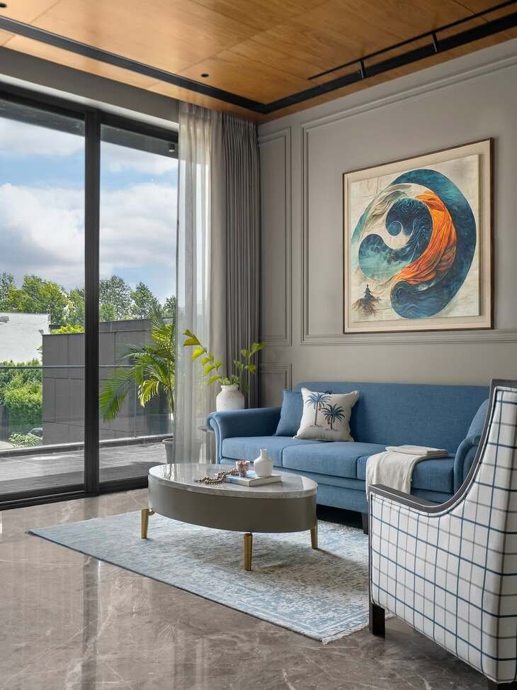 This living room gives major luxury vibes with its glossy grey flooring and minimalistic design. The room is sleek, modern, and sophisticated. The furniture is contemporary, with a clean design, and the coffee table is a statement piece that combines marble and metal for added glamour. The soft lighting enhances the luxe feel, while the grey flooring keeps everything grounded.