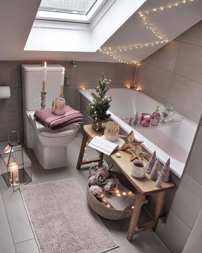 The last look is my winter spa fantasy. I went with blush towels, a wood bench, a tray across the tub, and warm string lights along the ceiling line. A little tree in a ceramic pot and star ornaments on the bench finish it off. Yes, it’s girly and I love it. And guests love it too because it feels like a little retreat.