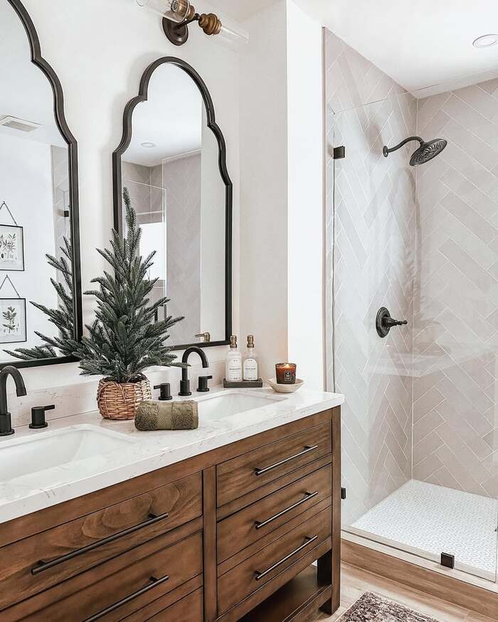 This one hits that modern classic look. The wood vanity feels earthy, the arched mirrors give a soft shape, and the matte black faucets make everything crisp. I popped a small tree in a woven basket between the sinks and added a single candle for glow. Don’t over-scent the candle. Guests nervous about strong smells will thank you.