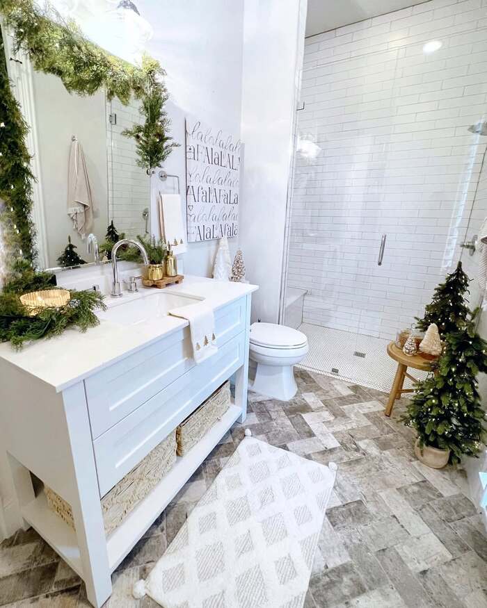 Neutrals with one or two holiday accents. Think white and wood with green, or navy with red. It keeps holiday bathroom decor from feeling messy.