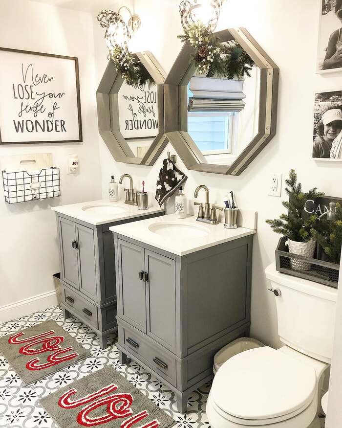 If you’ve got a jack and jill bath or just two small vanities, lean into pairs. I hung tiny greenery swags over both octagon mirrors using clear hooks. Matching “Joy” rugs made me grin, and the gray cabinetry keeps it calm. This is that space where cousins brush their teeth at the same time and giggle about Santa, so you need simple zones.
