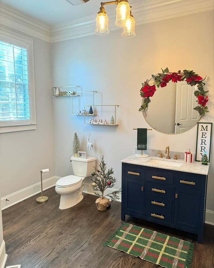 This look is bold and happy. The navy cabinet with brass pulls loves red and green, so I hung a poinsettia wreath on the round mirror and set a plaid runner in front of the sink. The open shelves near the toilet get simple letters that spell “Merry” and tiny bottle-brush trees. Keep the shelf colors limited so it doesn’t go chaotic.