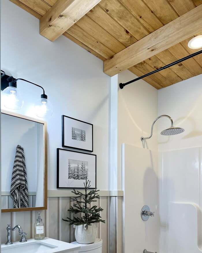 This one surprised me. The warm wood ceiling steals the show, so everything else stays quiet. I leaned into texture. Beadboard halfway up the wall, a tiny potted fir, and two simple black frames with winter tree prints. If you’re short on art, print free tree sketches and put them in thrifted frames. It works.