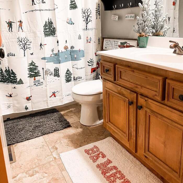 Sometimes the shower curtain can be the whole scene. I swapped in a winter village curtain that looks like a tiny skating rink party. It eats up visual space so the rest stays quiet. Wood cabinets keep it homey, and I added one snowy tree on the counter for balance. Two rugs make the floor feel layered and cozy for cold toes.