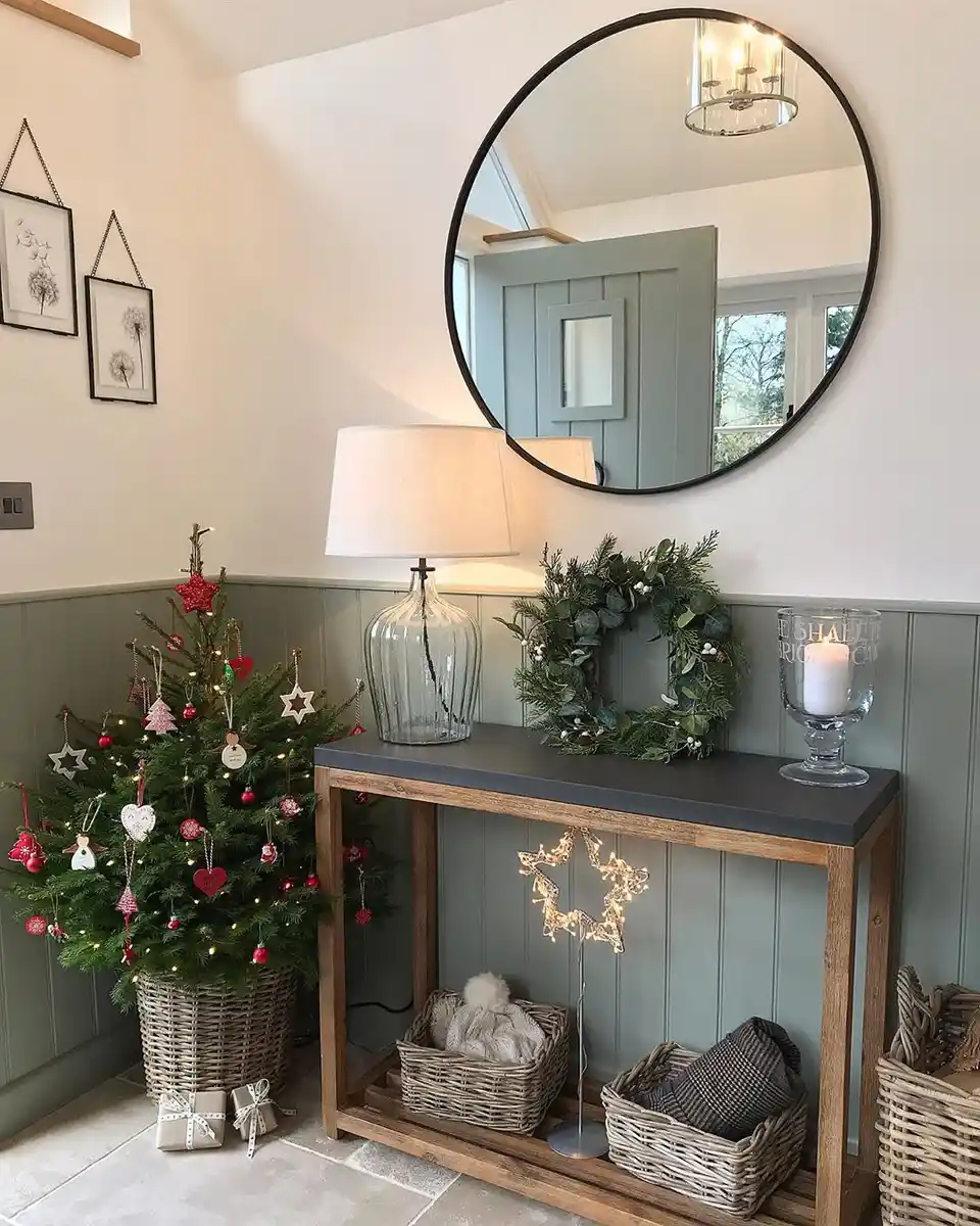 Sage beadboard, warm wood, and a small tree in a wicker basket make this corner feel like a hug. Add a eucalyptus wreath, a star light tucked on the lower shelf, and a big round mirror over the console. Baskets below corral mittens and scarves.