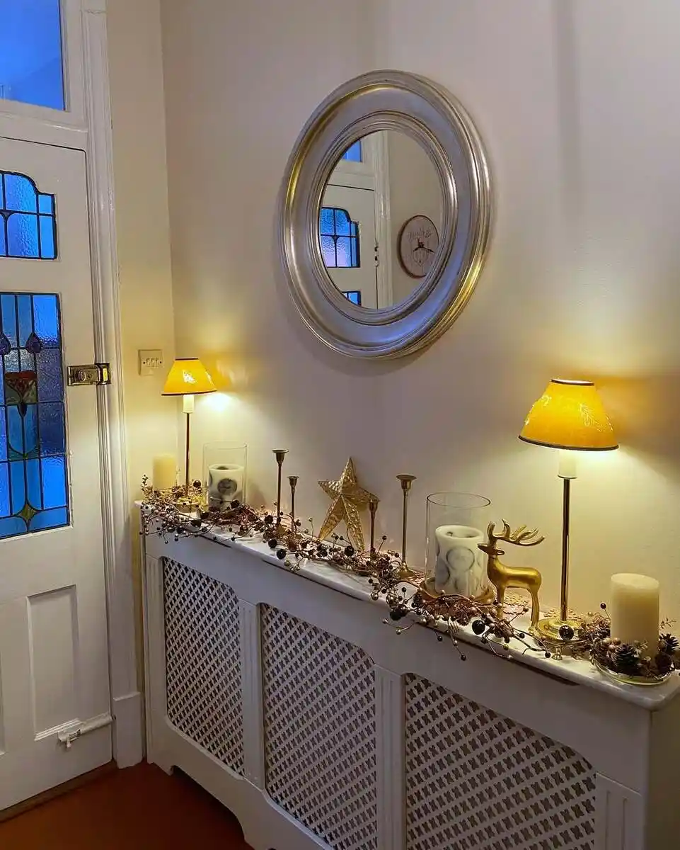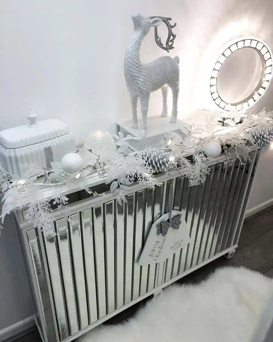 A mirrored radiator cover turns into a mini winter wonderland. Layer a snowy garland of frosted leaves, glitter pinecones, and white ornaments. Set a textured white reindeer beside a glowing ring light so sparkle bounces around the narrow hall. Finish with a fluffy rug for warmth.