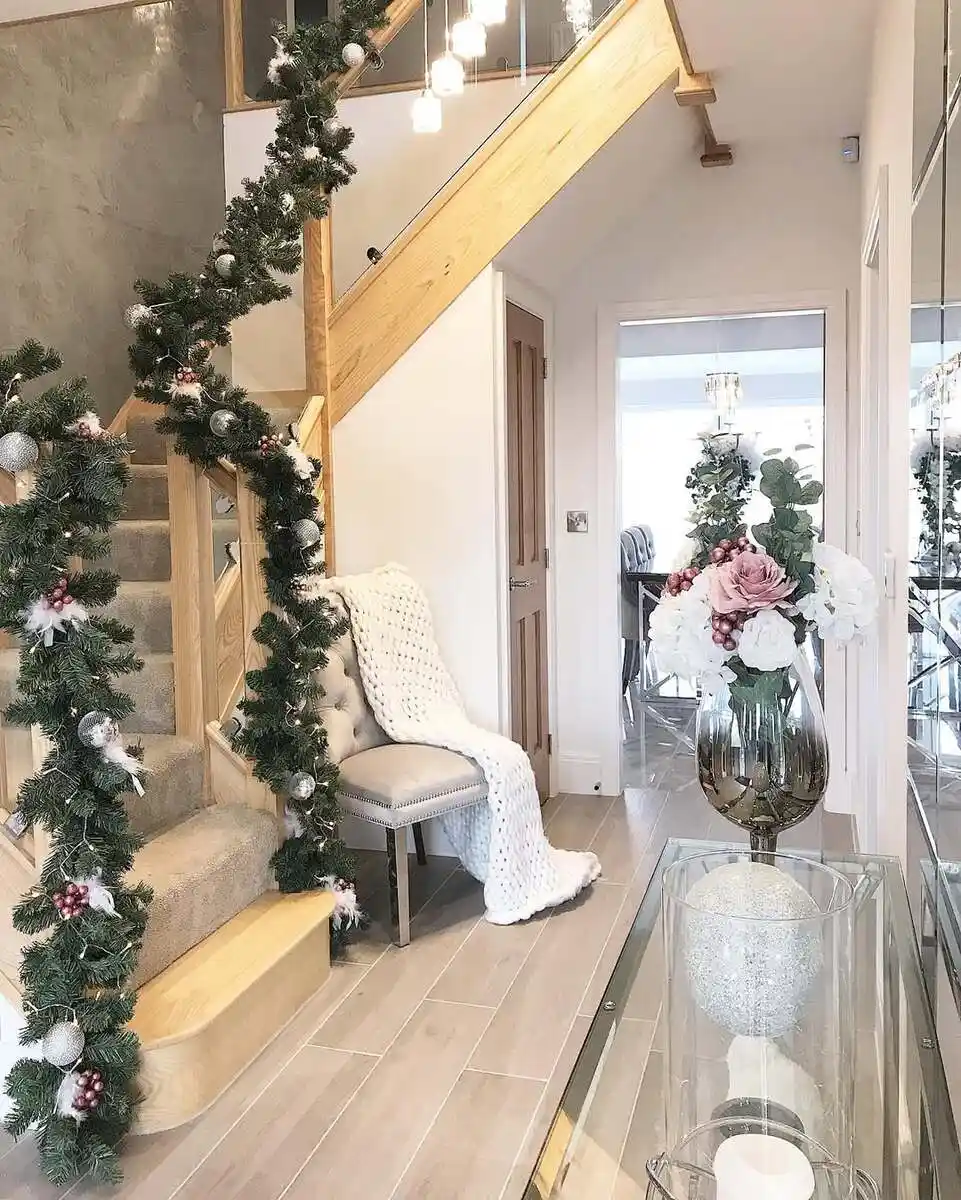 Let your banister do the heavy lifting. A full evergreen garland winds up a light oak staircase, dotted with silver baubles, frosted berries, and tiny white birds. Park a tufted chair on the landing with a chunky knit throw for texture. On a glass console, pale pink and white blooms add romance.