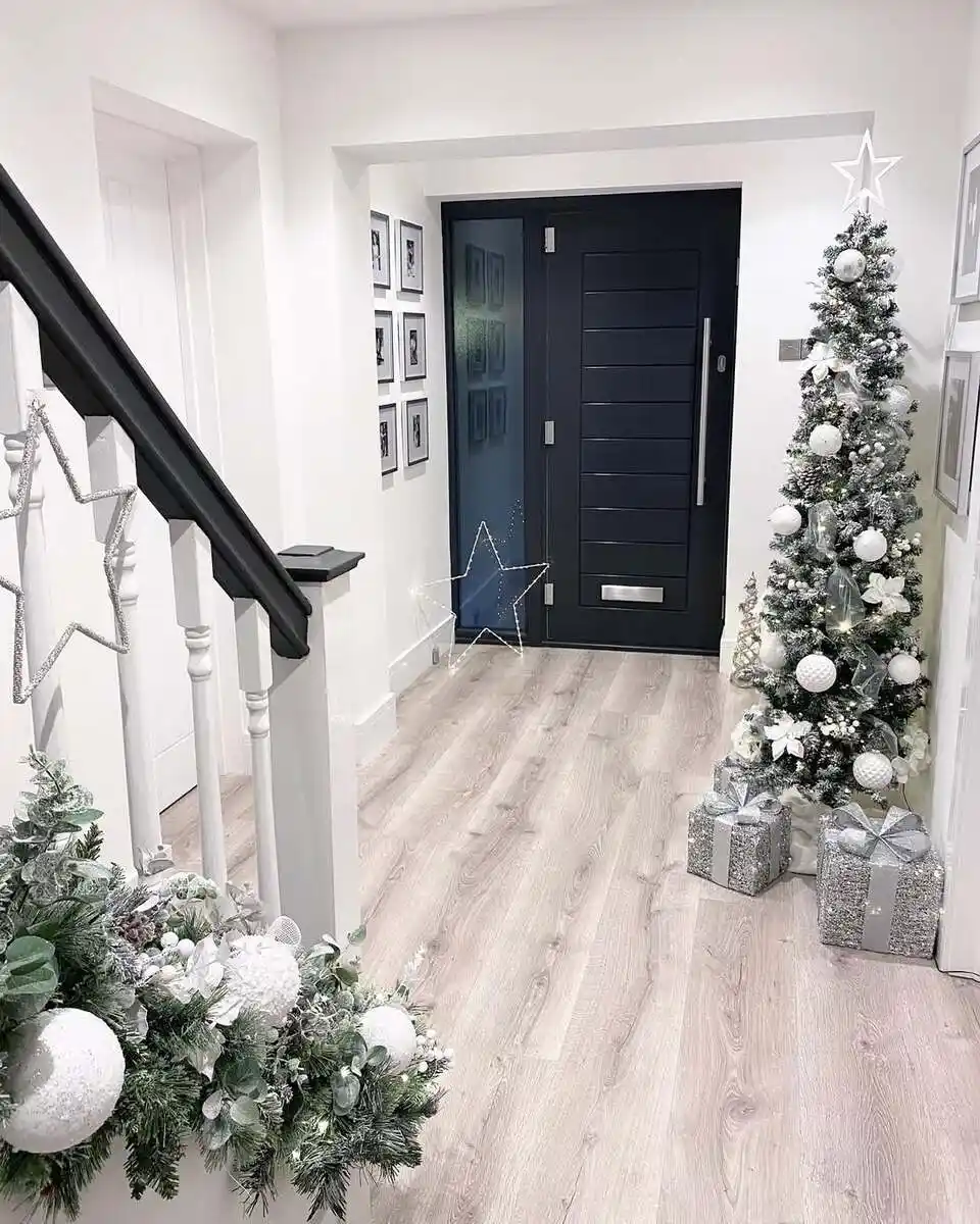 Monochrome Christmas hallway decorations are shockingly easy because everything matches by default. If you need warmth, bring in a jute runner or wood picture frames. It keeps the modern hallway holiday decorations from feeling cold.