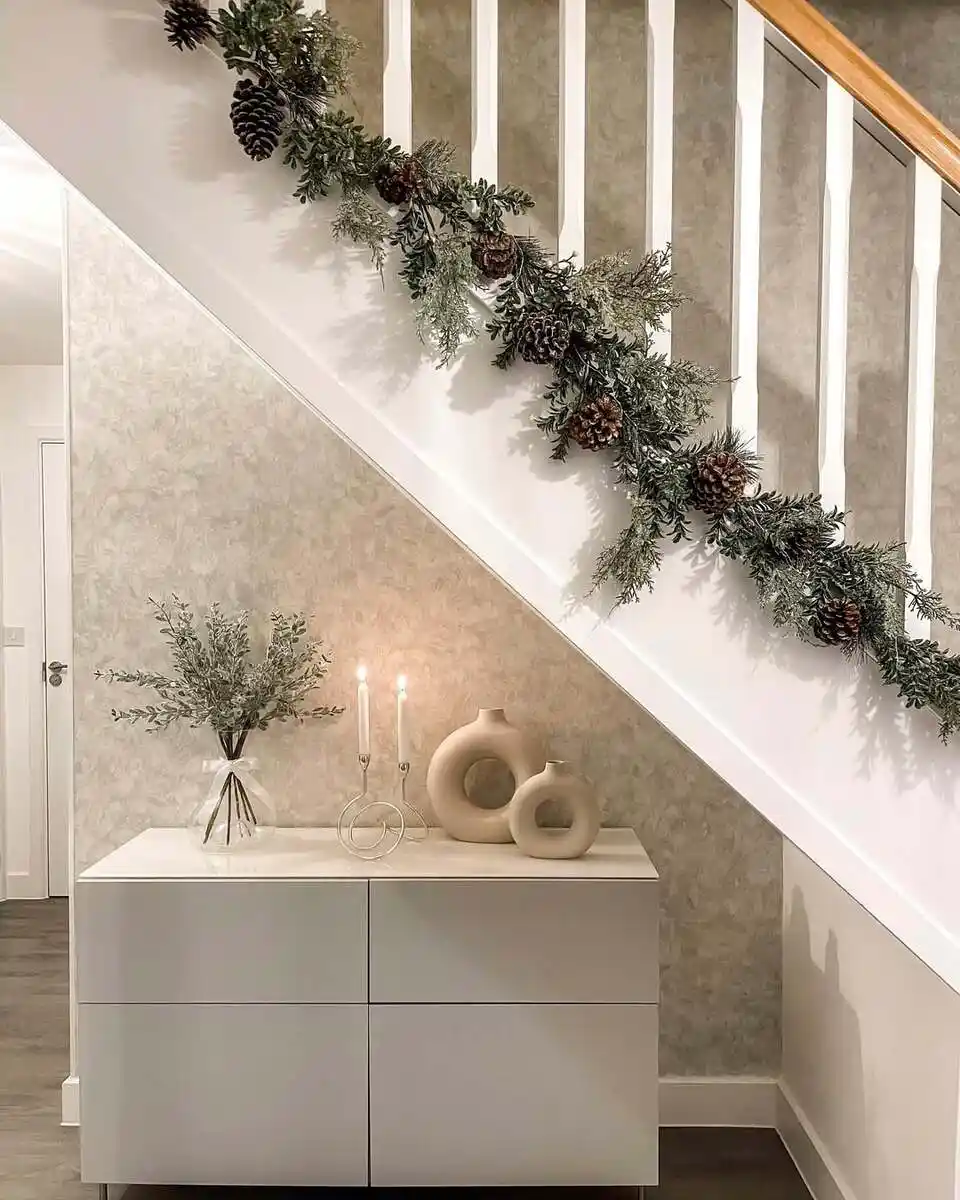 Under the stairs, a simple white cabinet displays sculptural neutral vases and taper candles. Above, a chunky cedar garland with large pinecones drapes naturally along the railing. The whole scene is calm, organic, and quietly festive.