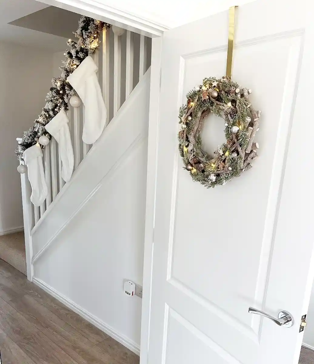 Nothing says family like stockings in the hall. Run a frosted garland along the stair rail with warm lights and champagne ornaments. Hang plush white stockings in a neat row. On the nearby door, a twiggy wreath with fairy lights ties it all together.