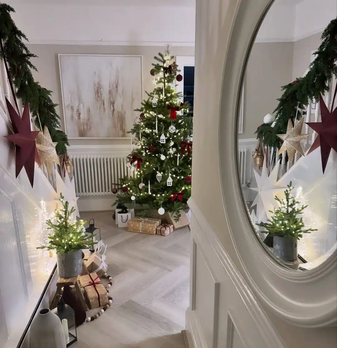 I like this hallway christmas decor because it feels like a small hotel lobby at home. Keep metals coordinated, like soft gold and silver together, and tuck warm white fairy lights deep into the greenery. For festive hallway decor on a budget, use big inexpensive shatterproof balls. They fill space fast.
