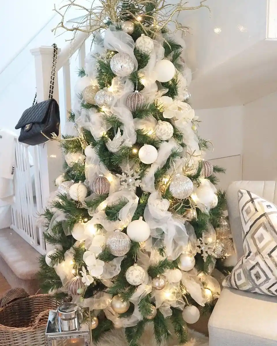 Set a lush tree by the stairs and pack it with soft white mesh ribbon, pearl baubles, and champagne ornaments. Warm lights weave through and the corner glows. A lantern and a wicker basket nearby ground all that sparkle.