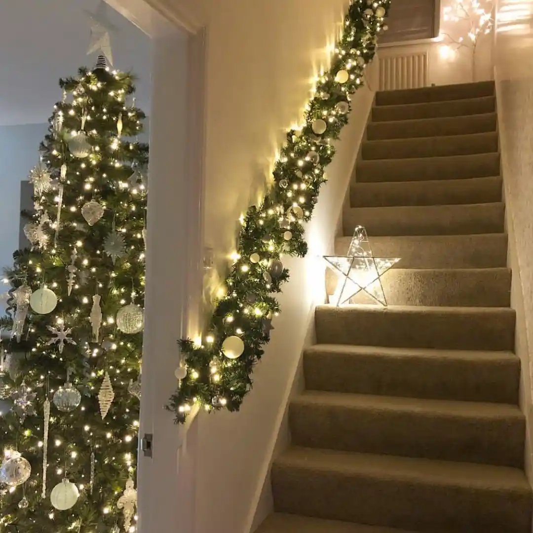 Attach garland with zip ties under the handrail, not on the step edge. Choose soft wired ribbon and shatterproof baubles. Keep the treads clear.