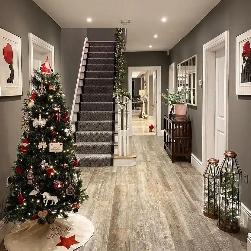 This one has the best of both worlds. A full tree decked in red and white sits beside a staircase wrapped in evergreen. Keep your hallway christmas decor grounded with soft gray paint and wood plank floors. Along the baseboards, place tall lanterns filled with faux snow and battery candles. It’s cozy and a little grown-up without losing the fun.