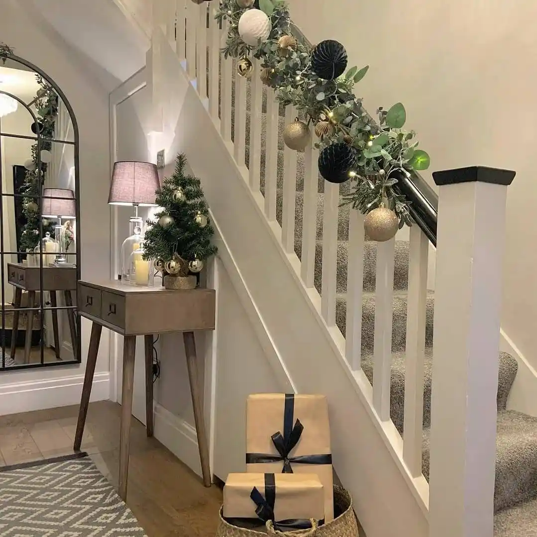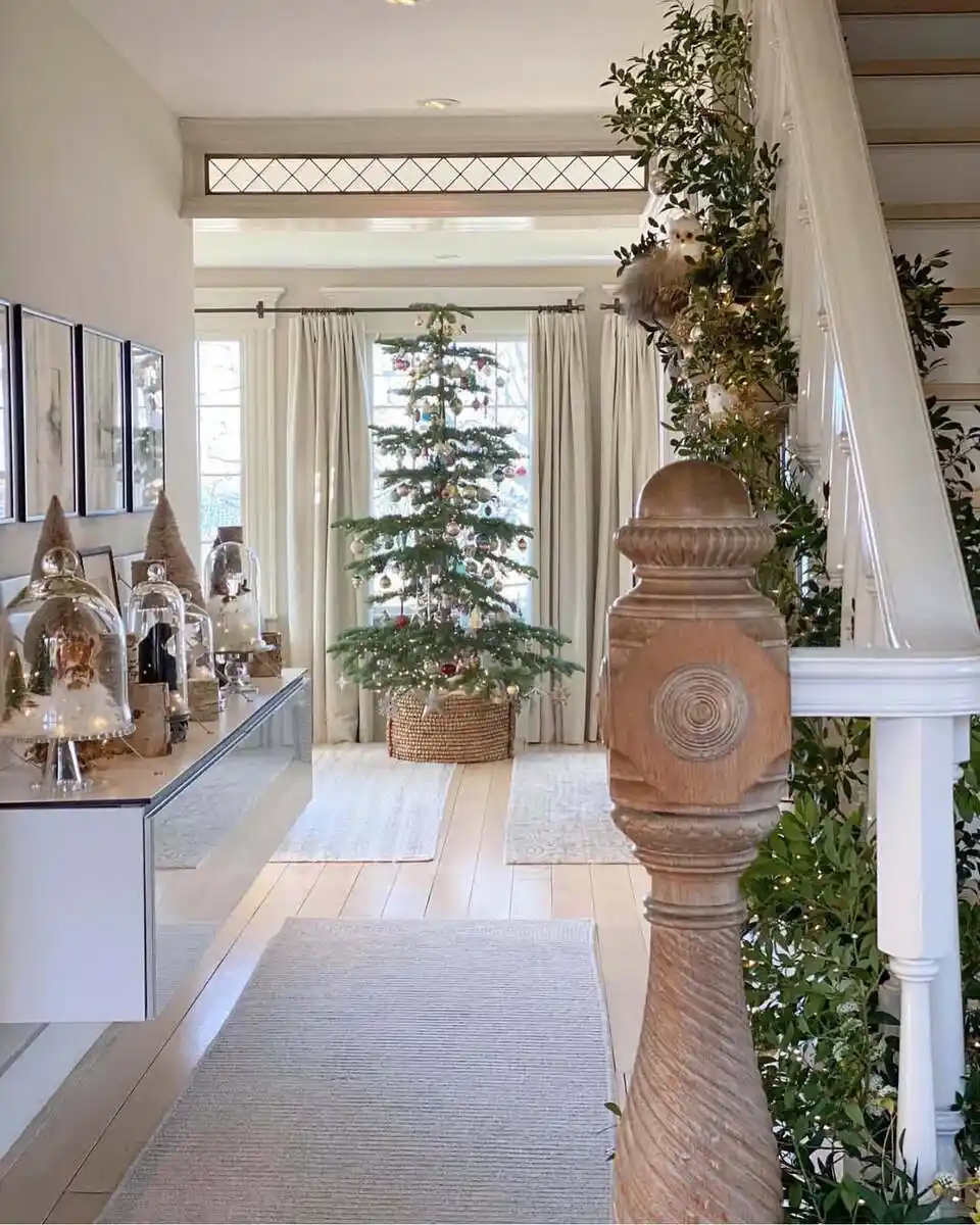 This look is calm and still festive. At the end of the bright hall, place a slim tree in a woven basket and hang only a few delicate ornaments. On the console, line up bell jars with tiny trees or ceramic houses. Wrap the stair in a leafy garland rather than dense pine to keep sightlines open.